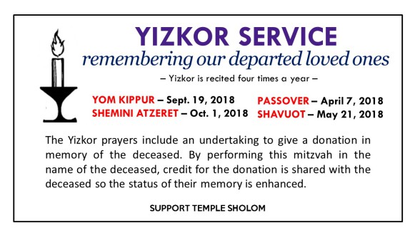 The Book of Remembrance is printed and made available during the High Holy Day services, starting with the Yizkor Service on Yom Kippur and is also used during other appropriate times of the year. Click to include the name of a dearly departed member of the Jewish faith in the Book of Remembrance.